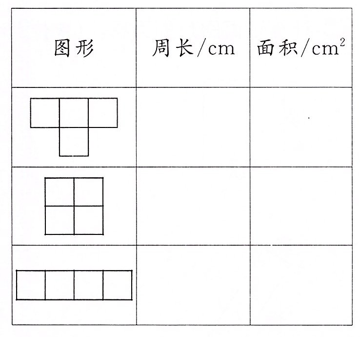 五 用4个1平方厘米的小正方形拼成下面图形,它们的面积各是多少?周长呢?