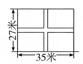 五 长方形菜地长 35 米,宽 27 米,菜地中间留了 2 条宽 1 米的小路(如下图),把菜地平均分成了 4 块,每块菜地的面积是多少平方米?
