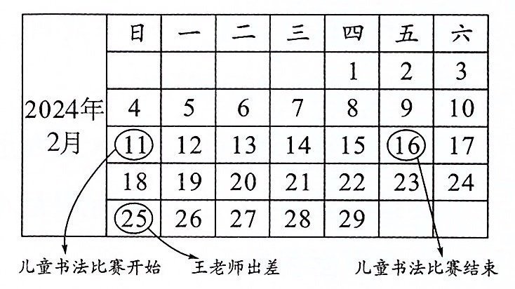 3. 王老师3月3日晚上从外地学习回来,回来那天是星期( ),共出差了( )天。