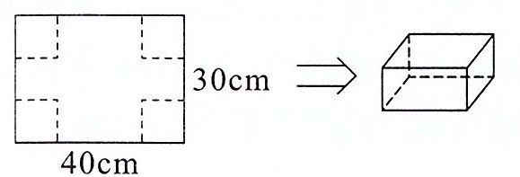 (昆明市官渡区)有一块长方形铁皮,长 40cm,宽 30cm。如果在四个角分别切下边长 10cm 的正方形,然后做成一个水槽,这个水槽的容积是多少升?