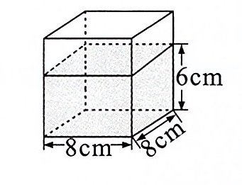 五 一个长方体容器,底面是一个边长为 $8cm$ 的正方形(如图),其中水面高度 $6cm$。现将一个长 $6cm$,宽 $5cm$ 的小长方体完全浸没在水中(水未溢出),这时水面上升了 $3cm$,这个小长方体的高是多少厘米?