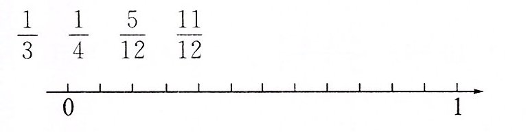 这条直线上的最小刻度用分数表示是( ),它是分数( )和( )的分数单位。