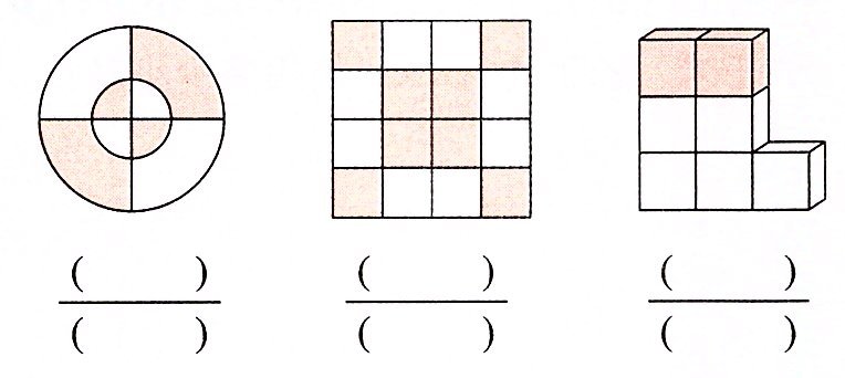 二 把下面每个图形都看作单位“1”,用分数表示各图中涂色部分的大小。