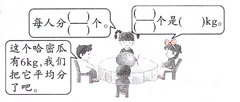 1. 把一块蛋糕平均分成6份,每份是这块蛋糕的$\frac{(\ \ \ \ \ )}{(\ \ \ \ \ )}$,3份是这块蛋糕的$\frac{(\ \ \ \ \ )}{(\ \ \ \ \ )}$,是把( )看作一个整体,也就是单位“1”。