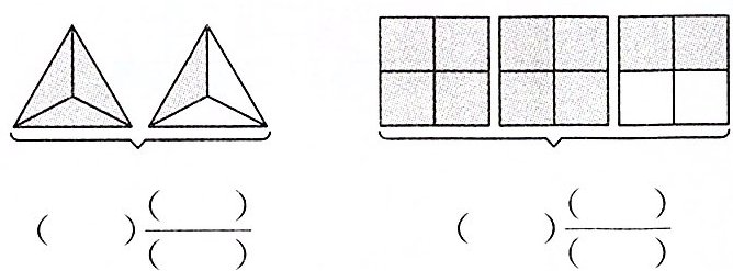 1. 3个人分,平均每人分$\frac{(\ \ )}{(\ \ )}$个,也就是( )个。