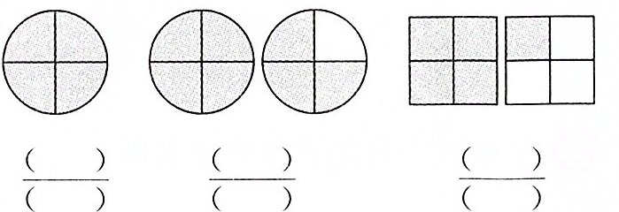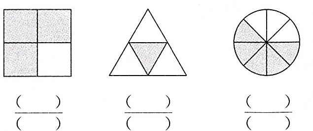 一 把一个图形看作单位“1”,用分数表示各图涂色部分的大小,再填一填。
