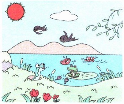 3. 例:游鱼 鱼在水中游。