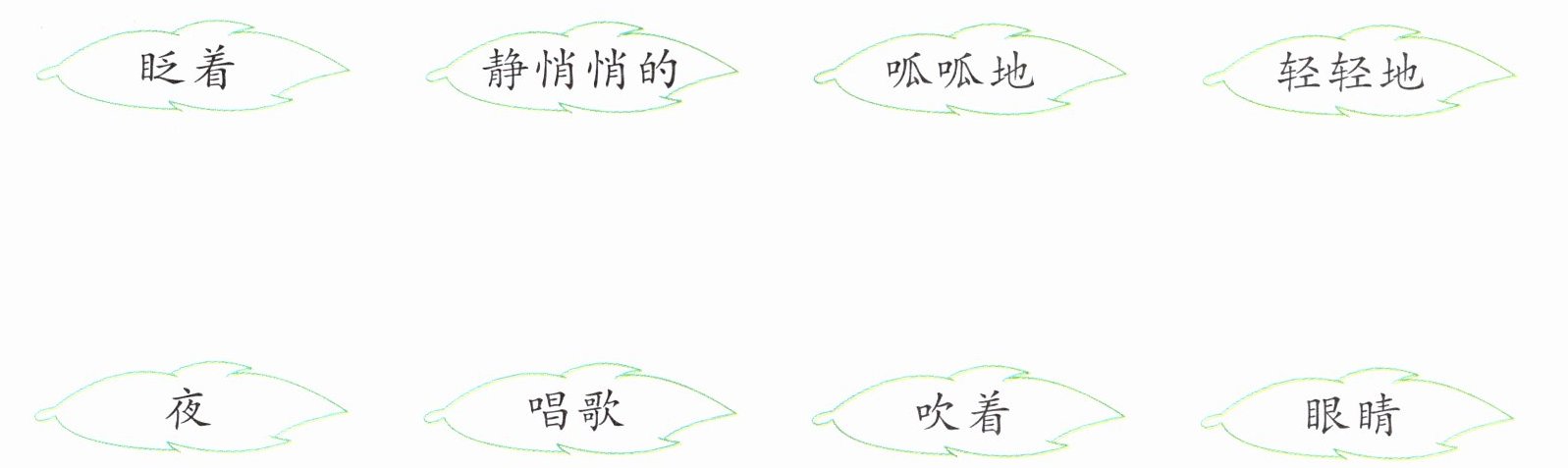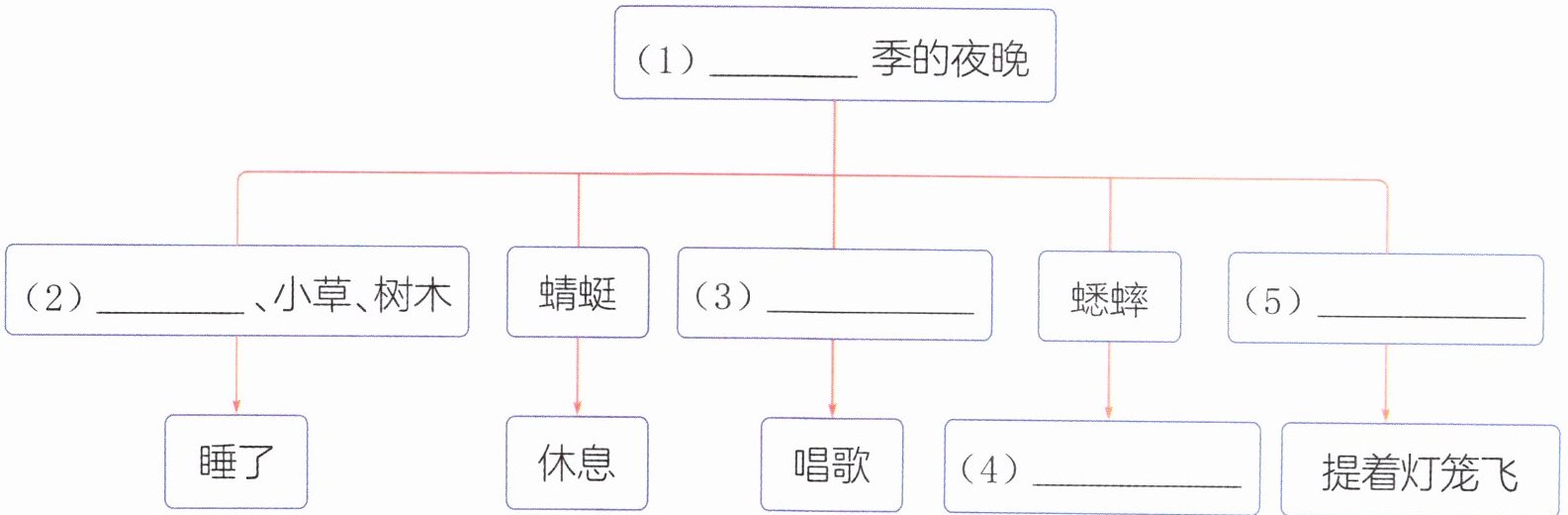 3. 蜻蜓 绿绿的大叶子 4. (1)夏 (2)花儿 (3)青蛙 (4)弹琴 (5)萤火虫