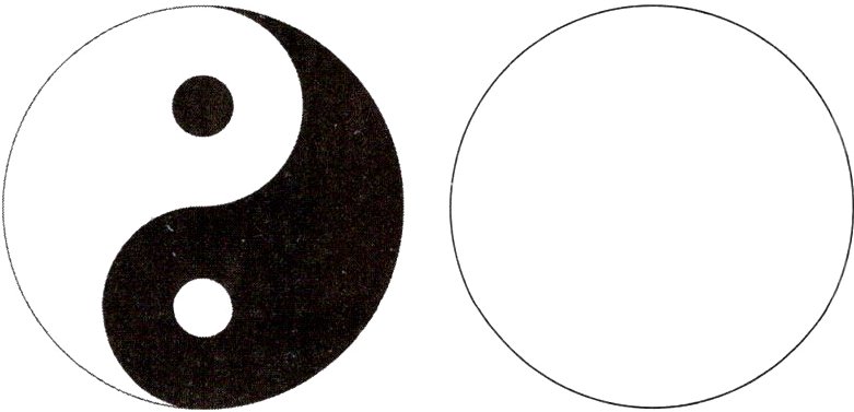 10. 太极图的形状为阴阳两鱼互相纠缠在一起,象征两极和合,因而又被称为“阴阳鱼太极图”。照样子在右边的圆里画一个。