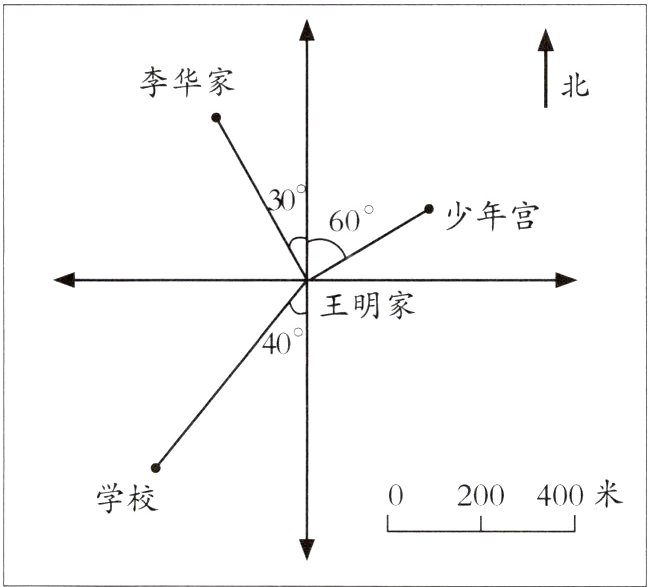 (2)李华家距离王明家的图上距离是( )厘米,实际距离是( )米。