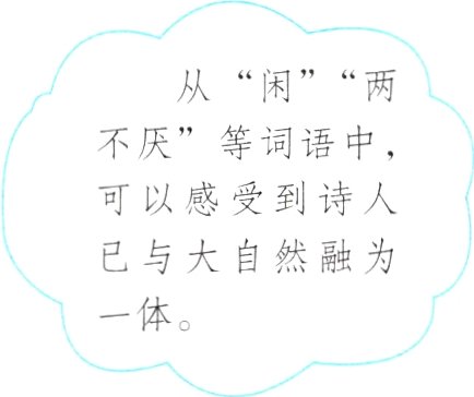 从“闲”“两不厌”等词语中,可以感受到诗人已与大自然融为一体。