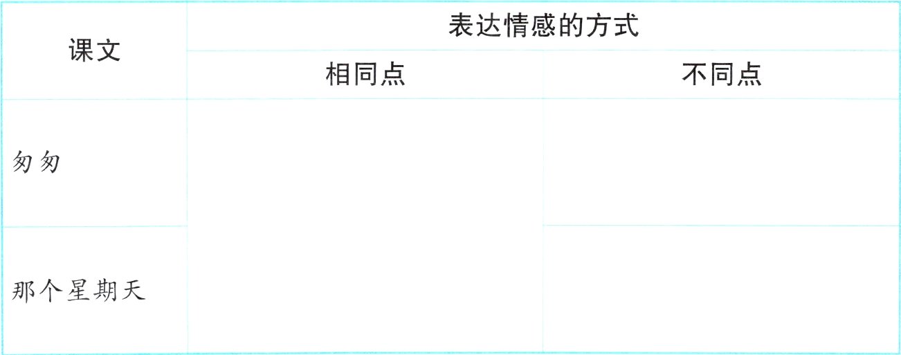 5. 联系教科书第50页“交流平台”,比较《匆匆》和《那个星期天》这两篇课文在表达情感的方式上有哪些相同点和不同点,填写下表。