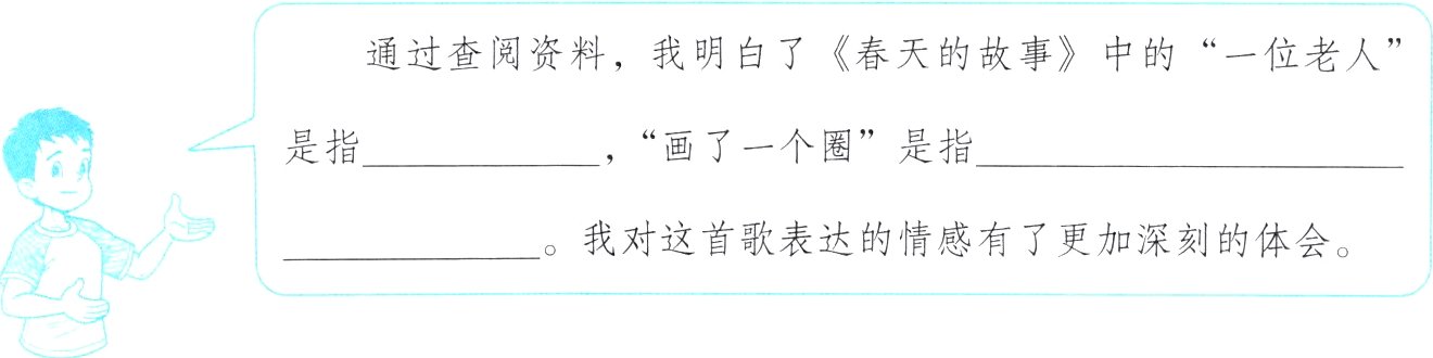 通过查阅资料,我明白了《春天的故事》中的“一位老人”是指 ,“画了一个圈”是指 。我对这首歌表达的情感有了更加深刻的体会。