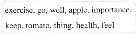 $exercise,$ $go,$ $well,$ $apple,$ $importance,$ $keep,$ $tomato,$ $thing,$ $health,$ $feel$