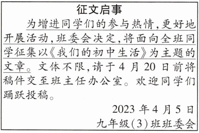 (2)为调动同学们的参与热情,更好地开展活动,班委会决定向全班同学征集以“我们的初中生活”为主题的文章。下面的征文启事存在一些问题,请按要求修改。
