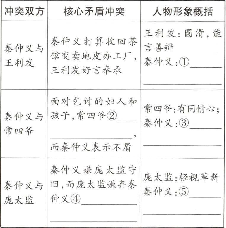 5.戏剧是通过矛盾冲突推进事件的发展、塑造人物形象的。请你阅读上文,完成下表。(5分)