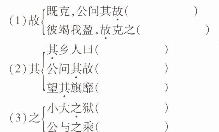 (1)原因,缘故 所以,因此 (2)代词,他的 指示代词,代指取胜 代词,他们,指齐军 (3)助词,的 代词,代指曹刿