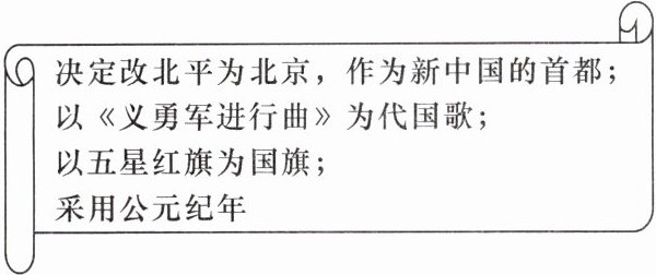 决定改北平为北京,作为新中国的首都;以《义勇军进行曲》为代国歌;以五星红旗为国旗;采用公元纪年