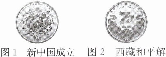 图1 新中国成立70周年纪念币 图2 西藏和平解放70周年纪念币