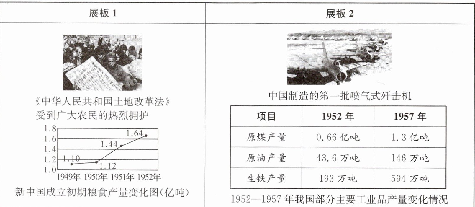 说明:展板1:土地改革消灭了地主阶级,解放了农村生产力,粮食产量迅速提高,土地改革成效显著。展板2:“一五”计划时期,我国制造了第一批歼击机,原煤、原油、生铁产量大幅度提高,我国在重工业方面取得巨大成就。(任选一张说明即可,3分)