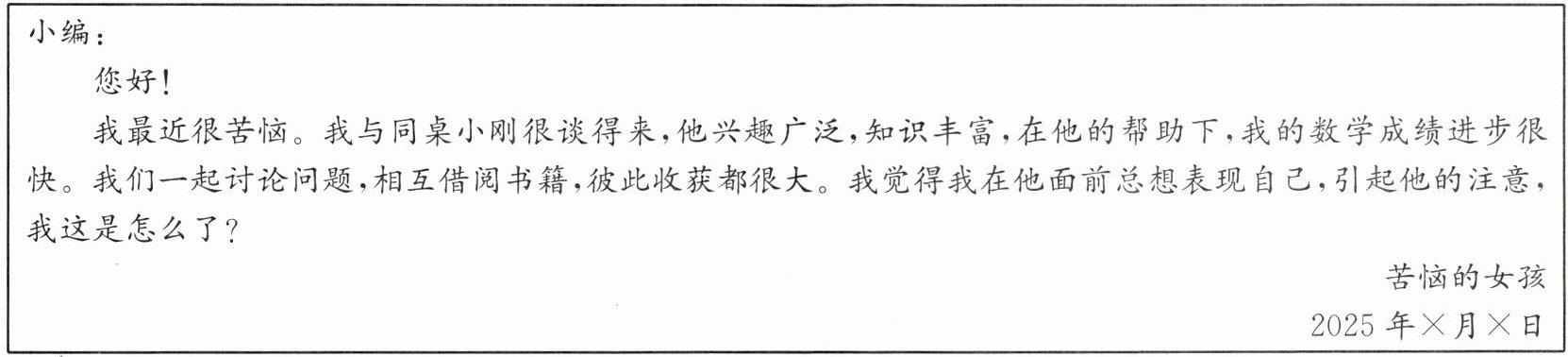 (3)假如你是“阳光心理驿站”的一名编辑,你会给这名苦恼的女孩回信说些什么?(写出要点即可)(4分)