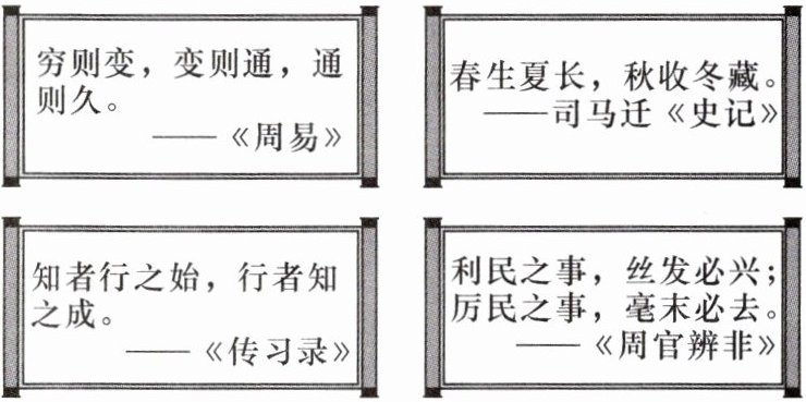 (1)①“穷则变,变则通,通则久”蕴含着革故鼎新、与时俱进的思想。②“春生夏长,秋收冬藏”蕴含着道法自然、天人合一的思想。③“知者行之始,行者知之成”蕴含着脚踏实地、实事求是的思想。④“利民之事,丝发必兴;厉民之事,毫末必去”蕴含着惠民利民、安民富民的思想。(1句1分)