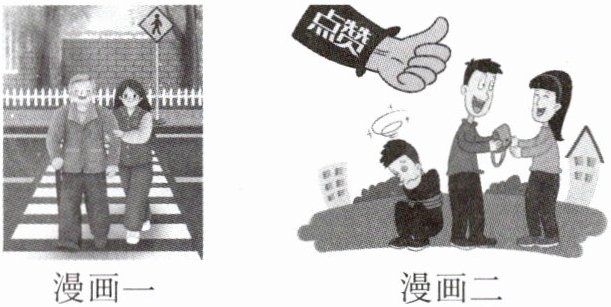 ①漫画中的人物践行了扶危济困、见义勇为的中华传统美德。②我们要向他们学习,大力弘扬和践行中华传统美德。③当他人身处困境时,主动伸出援助之手。当国家利益和社会公共利益受到侵害时,当他人遇到危难时,我们要敢于挺身而出,运用自己的智慧和力量维护国家利益和社会公共利益,帮助他人等。(1点2分)