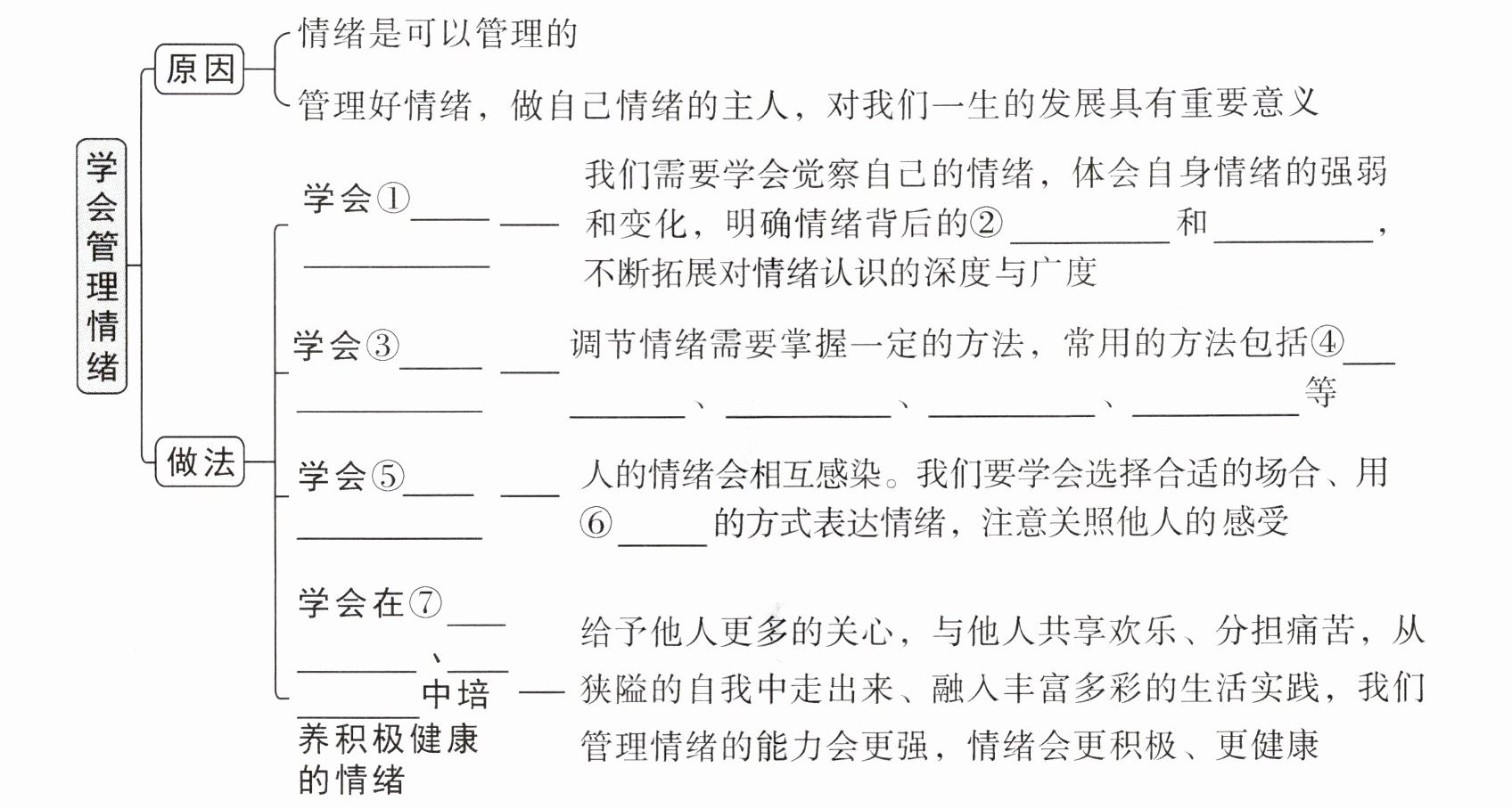 认识自己的情绪@@真实需要 现实原因@@调节情绪@@注意转移 合理宣泄 认知调节 放松训练@@合理表达情绪@@合理@@帮助他人 奉献社会