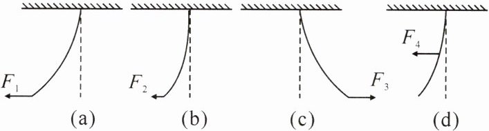 13. 小张同学做了一个实验,来验证力的三要素对力的作用效果的影响,如图,$F_{1}=F_{3}=F_{4}>F_{2}$,拉住一根锯条,使其发生图中(a)、(b)、(c)、(d)四种形变。