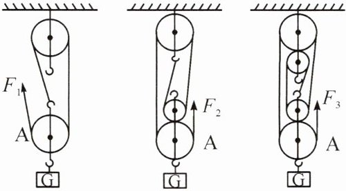 2. 如图所示表示三种不同的滑轮组,用它们提起重为G的相同重物,在A端所用的拉力分别为$F_1 =$______,$F_2 =$______,$F_3 =$______。(不计滑轮本身的重和摩擦)