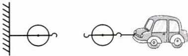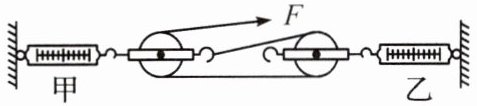 13. 如图所示,若$F = 10 N$,则甲、乙两个弹簧秤的读数分别为:______N,______N。
