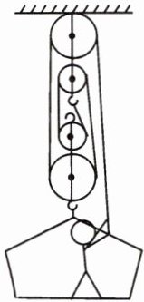 15. 如图所示,吊篮的重力为400 N,每个大滑轮重力为50 N,每个小滑轮重力为40 N,人的重力为600 N,人在吊篮里拉着绳子不动时人需用力 ( )