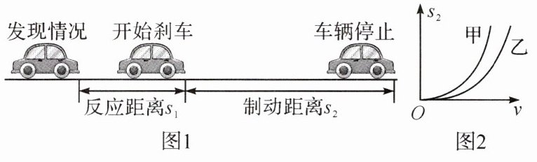 (5)图 2 是甲、乙两汽车在同一路面上紧急刹车过程中制动距离 $s_{2}$ 与车速 $v$ 的关系图像,则______(选填“甲”或“乙”)汽车的制动性能较好。
