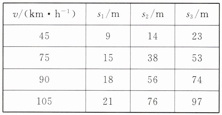 下表是同一位司机驾驶一辆保养得很好的甲汽车,在相同水平公路上以不同的速度 $v$ 行驶时(反应时间相同),测得的反应距离 $s_{1}$、制动距离 $s_{2}$ 和停车距离 $s_{3}$。