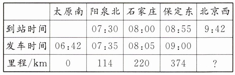 (2) 阳泉北到保定东的路程 s₁ = 374 km - 114 km = 260 km,阳泉北到保定东的时间 t₁ = 08:55 - 07:35 = 1 h 20 min = $\frac{4}{3}$h,则 G602 次高铁列车从阳泉北到保定东的平均速度:v₁ = $\frac{s₁}{t₁}$ = $\frac{260km}{\frac{4}{3}h}$ = 195 km/h。