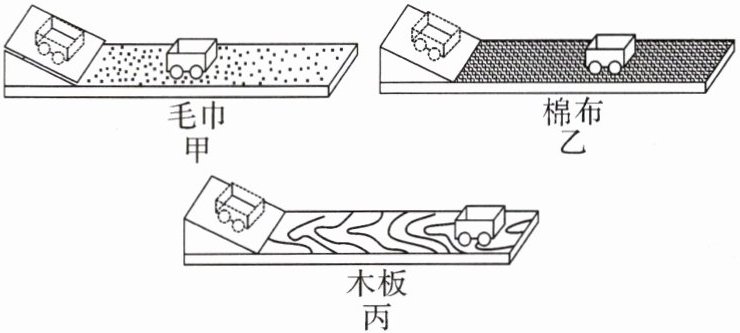 b. 如图乙,取下毛巾,将棉布铺在斜面和木板上,让小车从斜面顶端由静止滑下,观察小车在水平面上通过的距离。