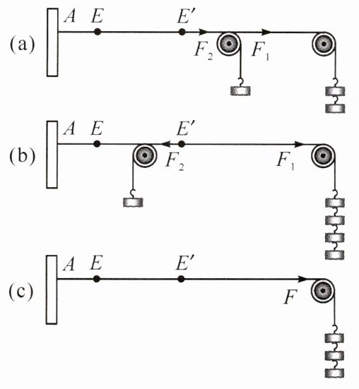 2. 如图是“探究同一直线上二力的合成”的实验装置,图中AE表示橡皮筋原来的长度,EE'表示橡皮筋伸长的长度。
