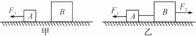5.(核心素养·科学思维)(双选)(2024·广州期中)水平桌面上有物体A、B。如图甲所示,A在F₁的作用下向左做匀速直线运动;如图乙所示,A、B用轻绳水平连接,在F₁和F₂共同作用下一起向右做匀速直线运动。水平拉力F₁ = 6 N、F₂ = 20 N。图乙中,下列说法正确的是( )