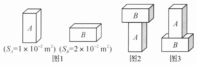 2. (2023·花都区期末)如图1所示,$A$和$B$为完全相同的两个长方体,均静止放置在水平地面上。已知$A$的底面积为$1\times10^{-2}\ m^{2}$,$B$的底面积为$2\times10^{-2}\ m^{2}$,$A$对地面的压强$p$为$2000\ Pa$。($g$取$10\ N/kg$)