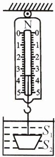 14.(多选)一个圆台形物体重为$G$,用细线悬吊在弹簧测力计下并浸没在液体中,如图所示,此时弹簧测力计的示数是$T$,物体受到的浮力是$F_{浮}$,物体上、下表面的面积分别是$S_{1}$和$S_{2}(S_{1}>S_{2})$,其上、下表面受到液体的压力分别为$F_{1}$、$F_{2}$。比较$G$、$T$、$F_{浮}$和$F_{1}$、$F_{2}$的大小可以判定( )