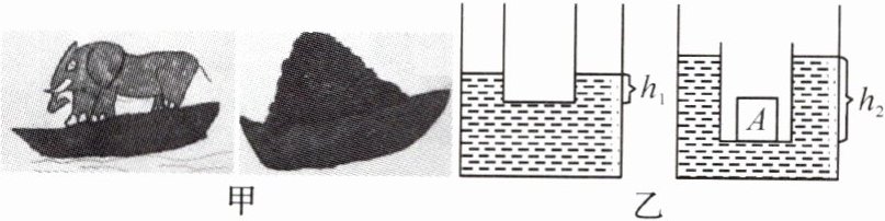 10.(2024·泸州开学考试)如图甲展示了一个广为人知的历史故事“曹冲称象”。将大象和石子分别放在同一船上,通过观察两次船的吃水深度来判断大象和石子的__________(选填“质量”或“体积”)是否相等,在小明学习了浮力的知识后,明白了其中的道理。受此启发,他设计了如图乙所示的方法测量物体$A$的质量,已知塑料盒的底面积为10 cm²,$h_{1}$大小为5 cm,$h_{2}$大小为13 cm,则物体$A$的质量为______g;放入$A$物体后,水对塑料盒底的压强为__________Pa(已知$\rho_{水}=1.0×10^{3}$ kg/m³,$g$取10 N/kg)。