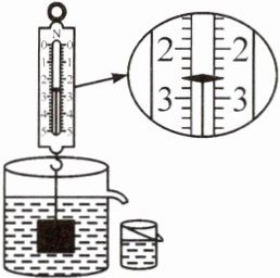 9.(2023·怀化)物理实验室里,同学们正在认真的完成“探究浮力的大小跟排开液体重力的关系”的实验。小明将重5 N的物体浸没水中后,弹簧测力计的示数如图所示。($\rho_{水}=1.0×10^{3}$ kg/m³,$g = 10$ N/kg)