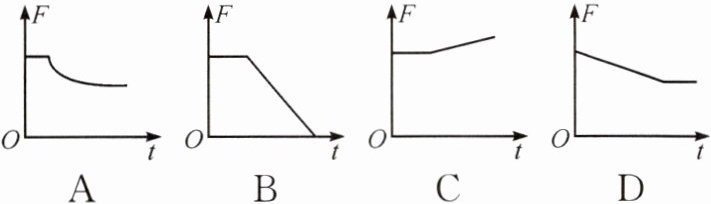 6. 小明看到鸡蛋浮在盐水面上,他沿杯壁缓慢加入清水使鸡蛋下沉。在此过程中,鸡蛋受到的浮力$F$随时间$t$的变化图像可能是下图中的( )