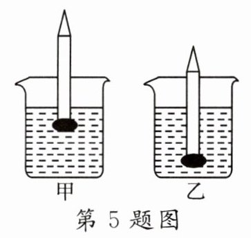 5.(2024·六安期末)小琴同学在铅笔下端粘上一块橡皮泥自制了一只密度计,将它分别置于甲、乙两种液体中,静止时如图所示,则密度计在甲、乙液体中所受浮力大小 ______ (选填“相等”或“不相等”),其中 ______ 液体的密度更大。