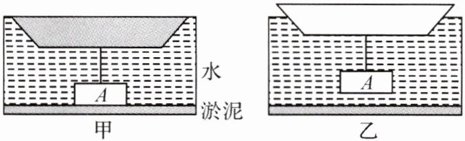 9.(2024·安庆期末)某同学受“怀丙打捞铁牛”故事的启发,设计了如下“打捞”过程:如图甲,金属块$A$部分陷入淤泥内,轻质小船装有18 N的沙石,细绳将金属块$A$和小船紧连,细绳对小船的拉力为2 N,水面刚好与船的上沿相平(水未进入小船内);将小船内所有沙石清除后,金属块$A$被拉出淤泥静止在水中,如图乙所示。已知金属块$A$的体积为$2\times10^{-4}\ m^{3}$,$\rho_{水}=1.0\times10^{3}\ kg/m^{3}$。$g$取10 N/kg,小船的质量、细绳的质量和体积忽略不计。