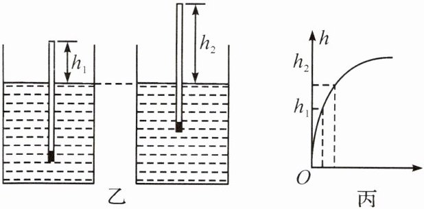 为了更准确地测量,他们选了表中某种材料做了简易密度计,如图乙所示,测得密度计在不同液体中露出液面的高度h,描点得到的图像如图丙所示,则图像中横坐标所表示的量是______(选填“G”“$F_{浮}$”或“$\rho$”)。