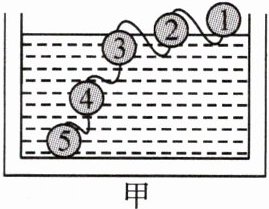5.(核心素养·科学探究)(2024·深圳三模)项目化小组用各种材料制作了5个不同密度的小球,分别标为1~5号。按顺序用长度相同的细线连接(忽略细线体积)。如图甲所示,将这串小球放入未知液体中,测出液体的密度。