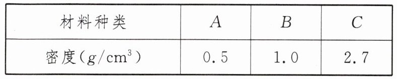 【项目制作】也可以称取不同质量的同种材料,制作成5个内部空心部分体积不同,但外部总体积相等的小球,将它们串连,放入待测液中,进行测量;分析表中材料,最合适制作的材料是______;