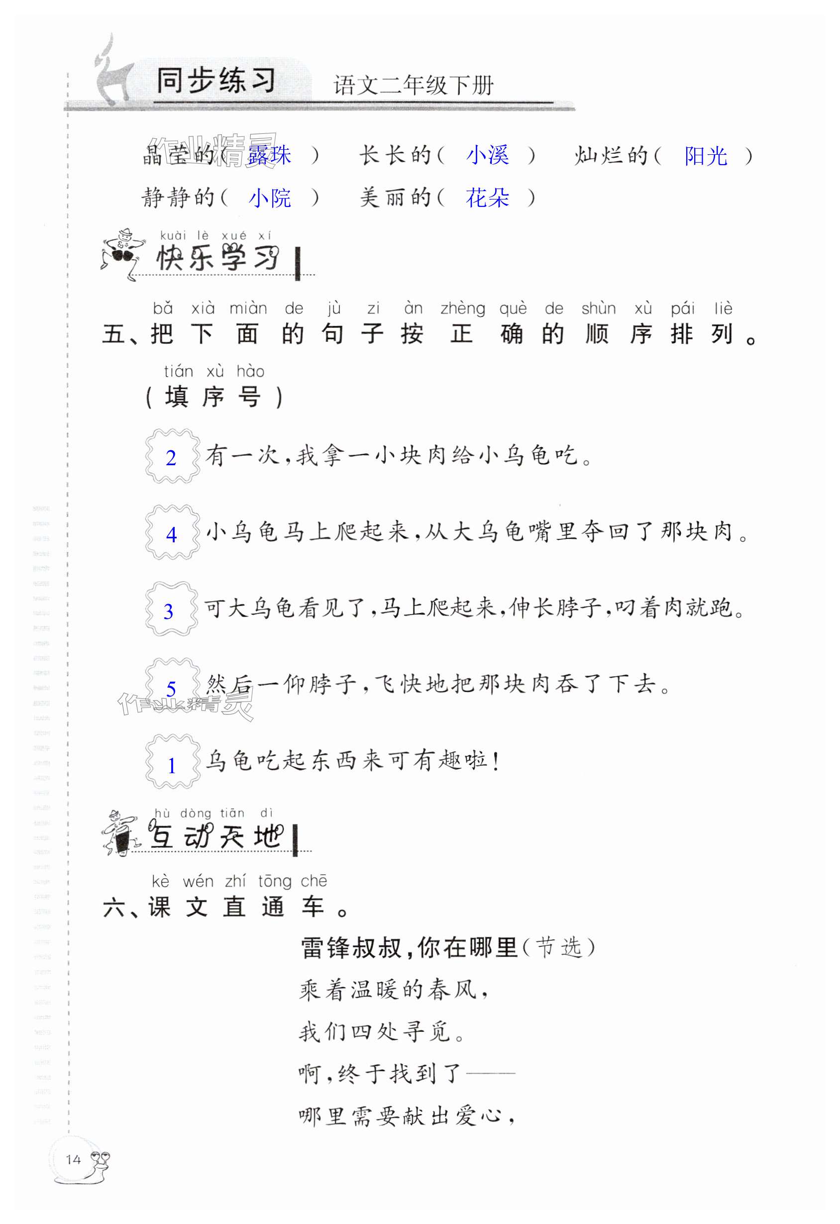 注:目前有些书本章节名称可能整理的还不是很完善,但都是按照顺序排列的,请同学们按照顺序仔细查找。练习册 2025年同步练习延边教育出版社二年级语文下册人教版 答案主要是用来给同学们做完题方便对答案用的,请勿直接抄袭。