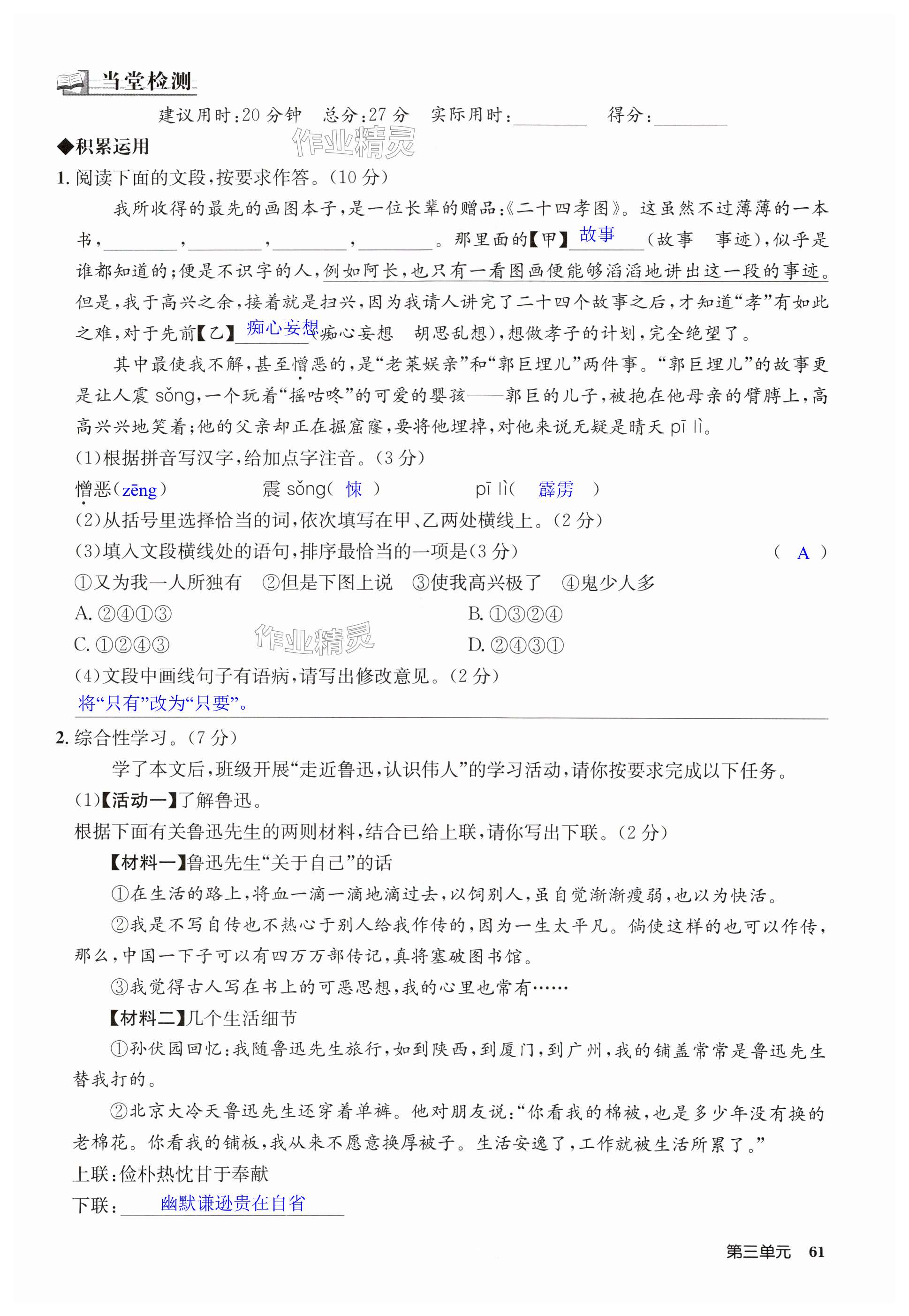 注:目前有些书本章节名称可能整理的还不是很完善,但都是按照顺序排列的,请同学们按照顺序仔细查找。练习册 2025年启东中学作业本七年级语文下册人教版宿迁专版 答案主要是用来给同学们做完题方便对答案用的,请勿直接抄袭。